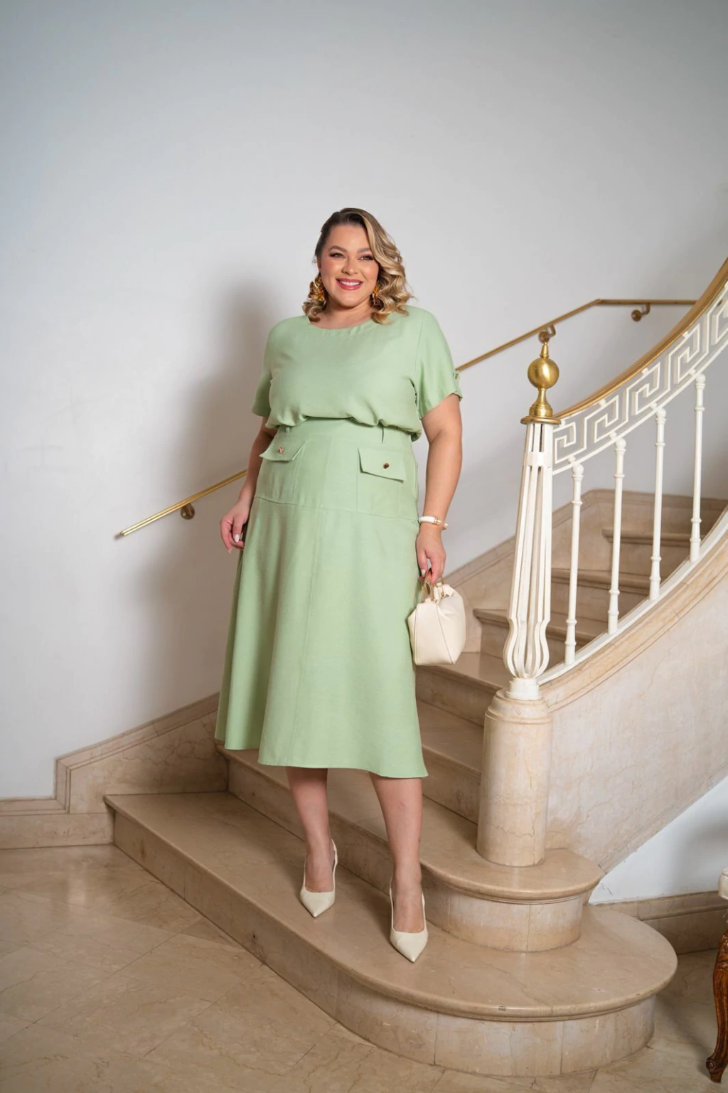 Descubra o Conjunto Feminino Blusa e Saia Botão Dourado ideal para qualquer ocasião! Este conjunto versátil é uma escolha perfeita para quem busca conforto e estilo.